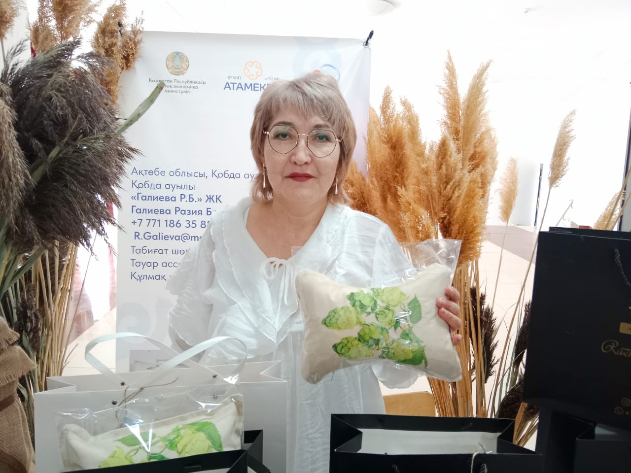 Көрмеге келгендердің арасында қобдалық қолөнер шебері Рәзия Ғалиеваның құлмақтан( хмель-ред.) жасаған жастығын тамашалаушылардың қатары да көп болды. Этно стильде ұлттық киім тігумен айналысатын кәсіп иесі ерекше иіс шығаратын көпшіктің шаршағанды басатын қасиеті бар екенін айтады.Айтуынша, құлмақтың құрамында эфир майлары бар. жастықшалар қан қысымын түсіреді. Тек демікпесі бар науқастарға ғана қарсы көрсеткіш бар. “Құлмақты Ресеймен шекаралас ауылдағы орманнан жинаймыз. Осыған дейін өзіміз жинап ,кептіріп келдік. Оның қасиетін, иісін жоғалтпау үшін арнайы қаптарда сақтаймыз. Жұмыс орнын ашқым келеді. Ауыл әйелдерін көбірек жұмыспен қамтамасыз еткім келеді.”-дейді шебер.