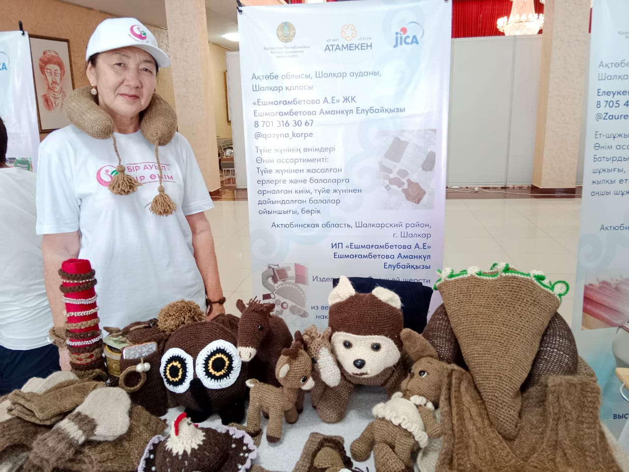 “Бір ауыл – бір өнім” көрмесіне қойылған заттар сан алуан. Кәсіпкерлердің бірі шоколадпен қапталған құрт әзірлесе, енді бірі ешкі сүтінен сабын жасап шығарған. Сөредегі төрт түлік малдың еті мен сүтінен жасалған өнімдер, этникалық нақыштағы зергерлік бұйымдар, бал өнімдері мен дәмі тіл үйірер құлпынайдың кейпі көз жауын алады. Жәрмеңке түрінде өткен көрмеде өз өнімін ұсынғандардың қатарында шалқарлық қолөнер шебері Аманкүл Ешмағанбетова да бар. Бұрыннан қыз жасауын жасап жүрген кәсіпкер бұл жолы түйе жүнінен жасалған қол өнер бұйымдарын әкелген.